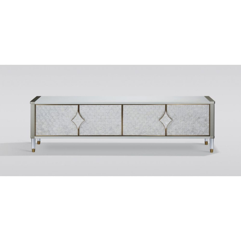 - Originaalne valge tv-alus eristub kalasoomust meenutava esiosa, kuldsete ribade, rombikujuliste käepidemete ja kuldsete aktsentidega jalgadega