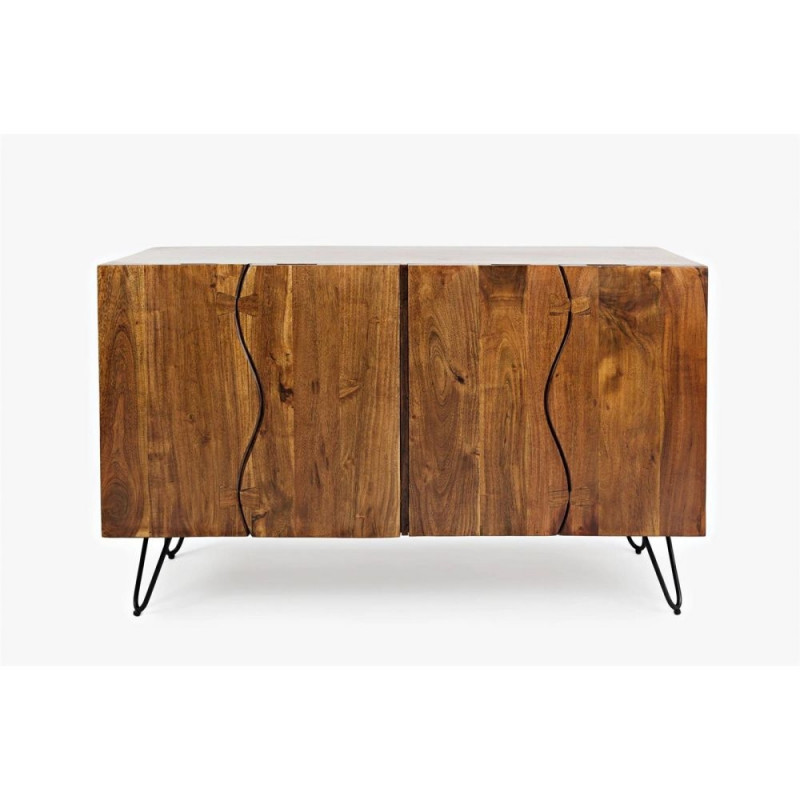 - Pähklitoonis naturaalsest akaatsiapuidust valmistatud puhvetkummutil on ebakorrapärase kujuga uksed ja puidu loomulikest omadustest tulenevad rõngad, mis lisavad sellele ainulaadse välimuse.