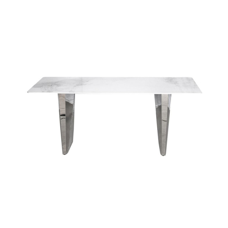 - Stiilne hõbedase roostevaba aluse ja marmor mustrilise valge plaadiga laud, geomeetriliste sileda ja tekstuurse viimistlusega jalgadega.