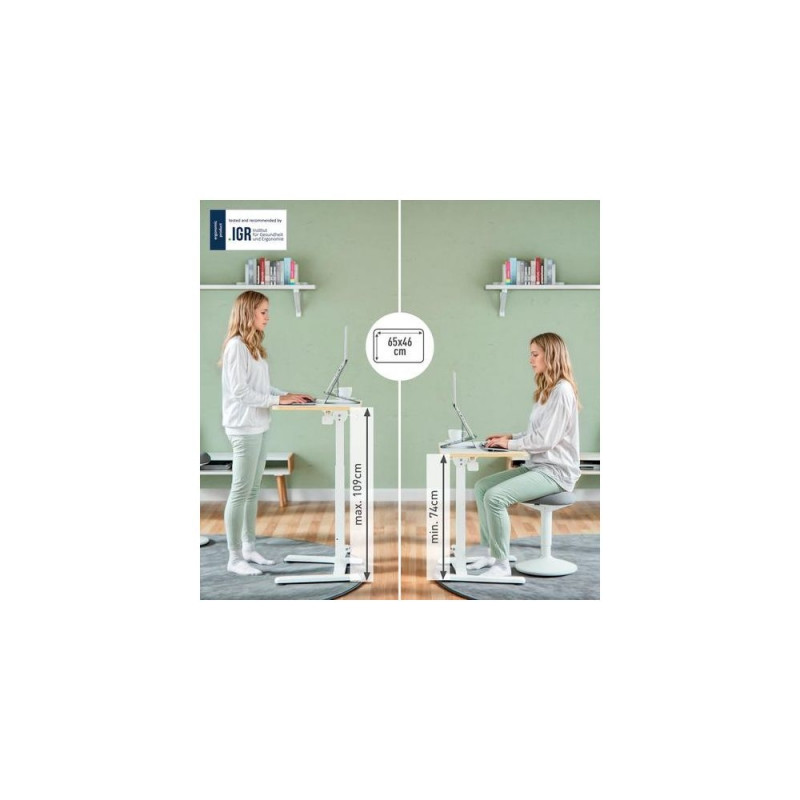 Imagine an ergonomic sit-stand laptop table that's cleverly designed to fit seamlessly into your life, even in the smallest temporary spaces. This laptop table effortlessly folds down to just 16cm width, making it ideal to store beside your cupboard, under the bed, sofa or meeting rooms when not in use. Weighing only 11kg, it's easy to move around. With simple setup and compact size, you can place it anywhere with ease. Its modern design enhances comfort and productivity, creating a workspace that can support your well-being. The compact design with a 65 x 46cm desktop is roomy enough for a laptop with stand, keyboard, mouse and even your favourite coffee mug! The GS (product safety) and TÜV (hazard and damage prevention) certified desk features smooth pneumatic height adjustment (74-109cm) allowing you to find the perfect ergonomic position sitting or standing. The portable sit stand desk is ideal for flexible use and as a temporary desk where space is limited in your living room, dining room, bedroom, office spaces and meeting rooms. This flexible, cleverly designed Foldable Sit Standing Desk is ideal for enhancing comfort and maximising productivity even in the smallest space. Our mission is to provide solutions that empower individuals to thrive at work and beyond, promoting positive mental health and physical wellness. Combine with other Leitz Ergo products to customize your flexible and individual sit, stand & move workstation. Stay active, feel inspired, and enjoy comfort at work and beyond – where human-centric design meets premium quality. FEEL GOOD with Leitz.Leitz Ergo Small Foldable Sit Standing Desk. Product colour: White, Maximum weight capacity: 20 kg, Height adjustment range: 740 - 1090 mm. Width: 650 mm, Depth: 470 mm, Height: 740 mm. Compliance certificates: GS mark, TÜV mark