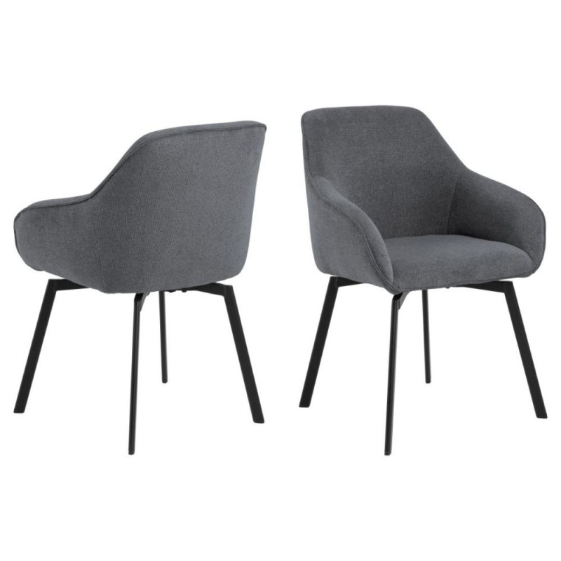 Elegantne söögitool Clara käetoega toob sinu söögirruumi kaasaegse ja mugava lahenduse. Tool on polsterdatud pehme antratsiitvärvise kangaga, mis ümbritseb kenasti vormitud istet. Tooli toetavad saledad mustad terasest jalad, mis on viimistletud kare pulberkatmisega. Tool on varustatud pöörduva alusega ja automaatse tagasipöördusfunktsiooniga, mis muudab kasutamise eriti mugavaks. Istme laius on 57 cm, sügavus 42 cm ja maksimumkõrgus 47 cm. Käetoe kõrgus põrandast on 64,5 cm.