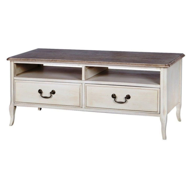 Elegantne Provence'i stiilis käsitsi värvitud TV-alus kõverdatud jalgadel. Korpus on elevandiluu värvi poolläikega viimistlusega, harjatud ülaosa freesitud servadega on helepruun nähtava tekstuuriga. TV-alusel on 2 sahtlit pehme sulgumise mehhanismiga ja 2 avatud riiulit, pakkudes rohkelt säilitusruumi. Mõõdud: 120 x 50 x 50 cm.