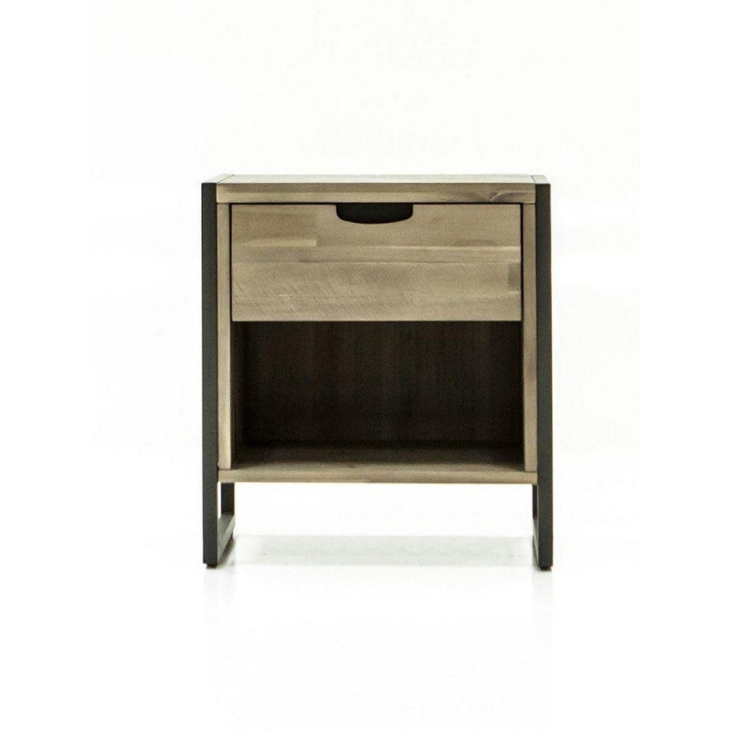 Unikaalne täispuidust loft-stiilis öökapp valmistatud kvaliteetsest harjatud eksootilisest akaatsiapuust ning täiustatud freesitud käepidemetega. See loob mööbliesemele elegantse ja ajatu välimuse, sobitudes suurepäraselt erinevatesse sisekujundusstiilidesse. Öökapil on 1 sahtel ja 1 riiul. Öökapi sahtel on varustatud pehme sulgumise mehhanismiga. Käepidemed on stiilselt freesitud. Jalad on metallist, viimistletud stiilse grafiithalli tooniga. Mõõdud: laius 55 cm, sügavus 40 cm, kõrgus 60 cm.