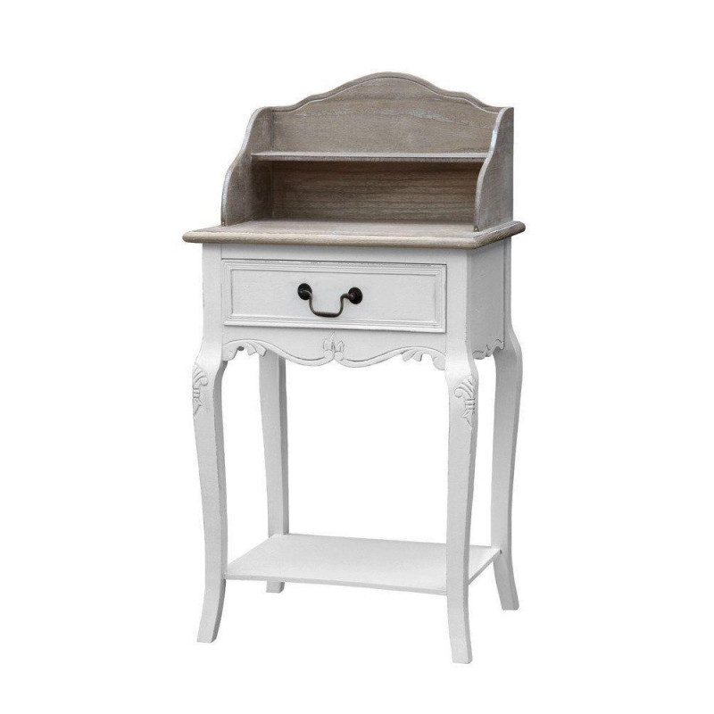Elegantne Provence'i stiilis öökapp valge korpuse ja tumepruuni MDF ülaosaga. Kapp on valmistatud Paulownia puidust painutatud jalgadega ja metallist käepidemete. Öökapil on 1 sahtel pehme sulgumise mehhanismiga ja 2 avatud riiulit. Mõõdud: 49 x 36 x 94 cm.