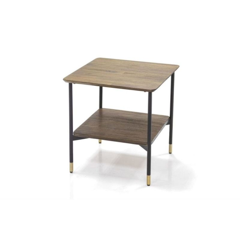 Täispuidust retrostiilis abilaud, valmistatud kvaliteetsest harjatud akaatsiapuidust ning täiendatud sirgete metallist jalgadega. See loob mööbliesemele elegantse ja ajatu välimuse, sobitudes suurepäraselt erinevatesse sisekujundusstiilidesse. Laual on üks eraldi riiul, mis pakub mugavat ja praktilist hoiuruumi erinevatele esemetele. Jalad on must värvi metallist, kuldsete detailidega otstes. Mõõtmed: 50 x 50 x 50 cm.