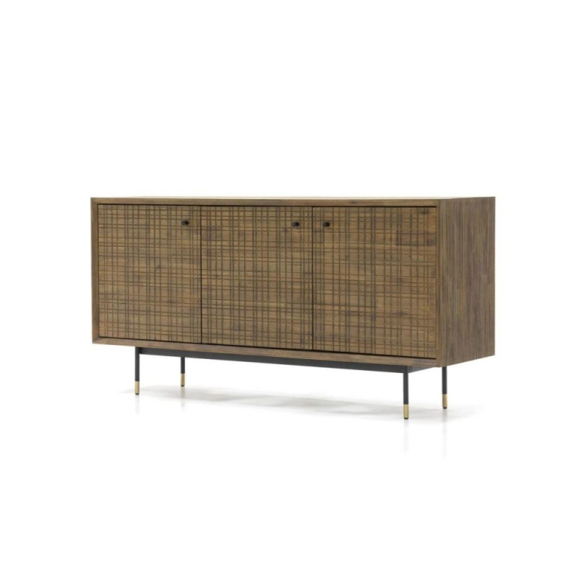 Originaalne retro-stiilis puhvetkapp, valmistatud kvaliteetsest harjatud eksootilisest akaatsiapuidust. Esikülgedel on 3D-struktuur nikerdatud asümmeetrilise ruudulise mustriga, mis loob elegantse ja ajatu välimuse. Kapp seisab sirgete mustade metalliste jalgade peal kuldsete detailidega. Kapil on 3 ust, mille taga on 1 riiul. Mõõdud: 160 cm laius, 45 cm sügavus, 80 cm kõrgus.