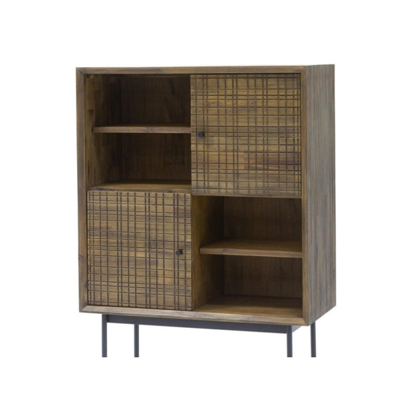 Originaalne retro-stiilis kapp, valmistatud kvaliteetsest harjatud eksootilisest akaatsiapuidust, seisab sirgetel metallist jalgadel. Esikülgedel on 3D-struktuur nikerdatud asümmeetrilise ruudulise mustriga, mis loob mööbliesemele elegantse ja ajatu välimuse. Kapil on 4 riiulit ja 2 ust pehme sulgumise mehhanismiga. Jalad on must värvi metallist kuldsete detailidega. Mõõdud: 85 cm laius × 40 cm sügavus × 130 cm kõrgus.