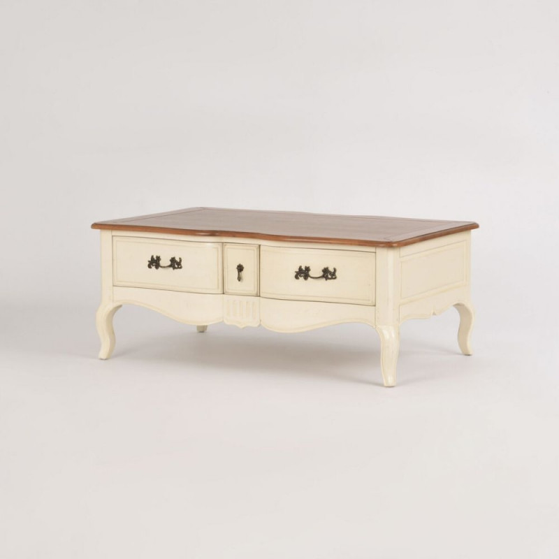 Elegantne täispuidust diivanilaud Provence'i stiilis painutatud freesitud jalgadega. Poolläikega elevandiluu värvi korpus ja meekarva läikiv ülaosa loovad iseloomuliku stiili. Laual on 6 sahtlit pehme sulgumise mehhanismiga ja roostevabast terasest käepidemed. Mõõdud: 122 x 80 x 49 cm.