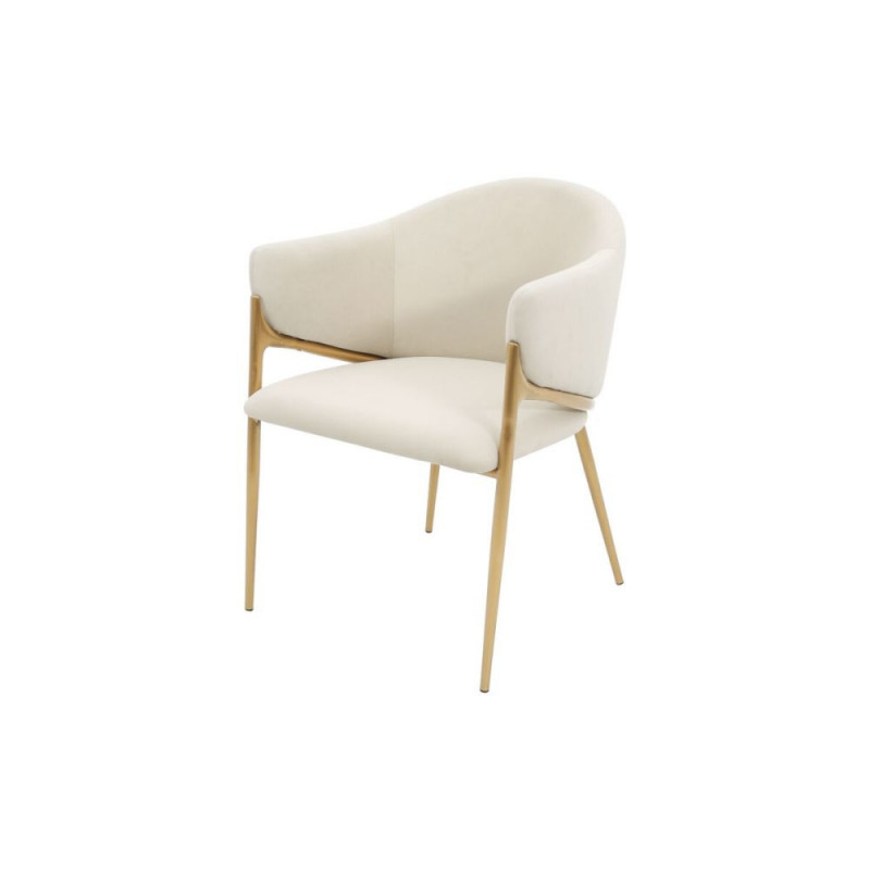 See glamuurne polsterdatud söögitool on kuldse asümmeetrilise raamiga ja harjatud roostevabast terasest jalgadega. Pehmest valgest sametisest kangast iste ja seljatugi lisavad igale söögitoale elegantsi ja luksuslikku ilmet. Mõõdud: laius 60 cm, sügavus 63 cm, kõrgus 76 cm.