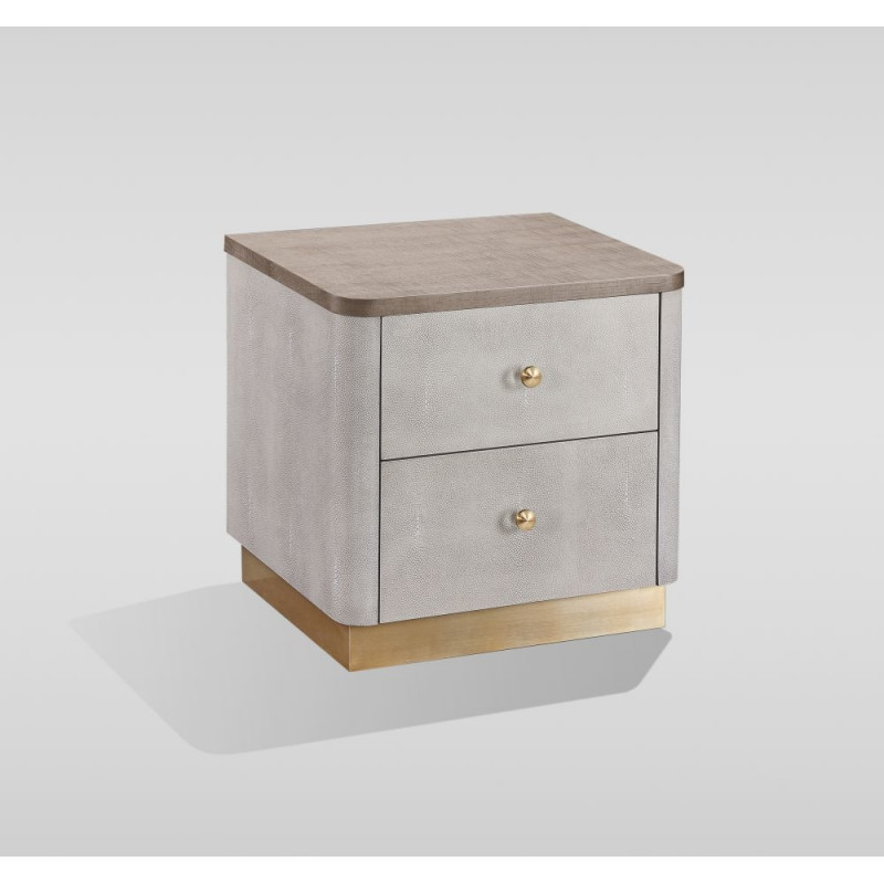 Elegantne beeži-halli tooniga öökapp on kaetud tekstuurse hai-naha imitatsiooniga kunstnahaga (shagreen-viimistlus), mis annab kapile luksusliku ja unikaalse välimuse. Kuldne metallalus täiendab disaini ning loob koos metallist käepidemete ja hall saare pealispinnaga elegantse üldmulje. Kahe sahtliga öökapp sobib suurepäraselt sama seeria vooditega. Mõõdud: 55 x 40 x 55 cm.
