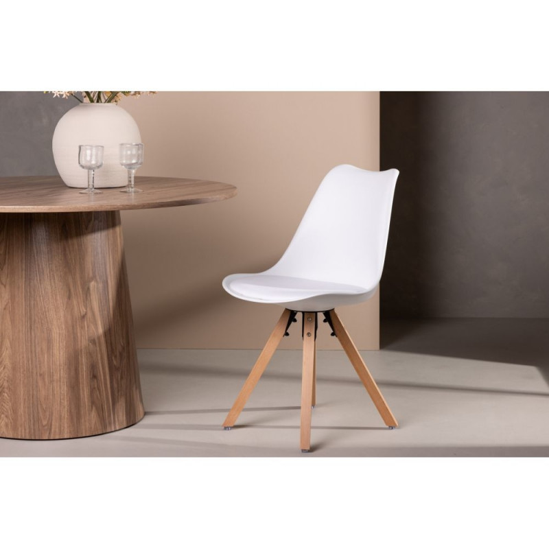 Zeno seeria stiilne söögitool, millel on valgest plastikust selja- ja istmeosa ning elegantsetest puidust jalad. Tool on varustatud integreeritud istmepadjaga, mis tagab suurepärase istumismugavuse. Istme kõrgus on 45 cm, laius 45 cm ja sügavus 44 cm. Tooli kandevõime on kuni 120 kg. Sobib suurepäraselt igasse kodu looma hubast söögiruumi õhkkonda.