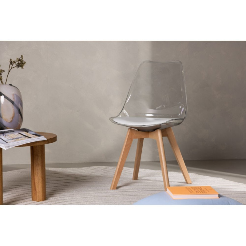Loo kaasaegne pilgupüüdja ja anna tooni Edvin sarja elegantsete söögitoolidega! See tool on ilmekas ja õhkab moeteadlikkust teie kodus. Läbipaistev iste on PET-materjalist koos valge istmepadjaga lisamugavuse tagamiseks. Toolijalad on kergelt laienenud naturaalsest pöögipuust. Sobib ideaalselt stiilse söögialaua ümber, et luua täiuslik koht, kus lähedasi kogunetakse. Istme mõõdud: kõrgus 46 cm, laius 48 cm, sügavus 44 cm. Kandevõime 120 kg.
