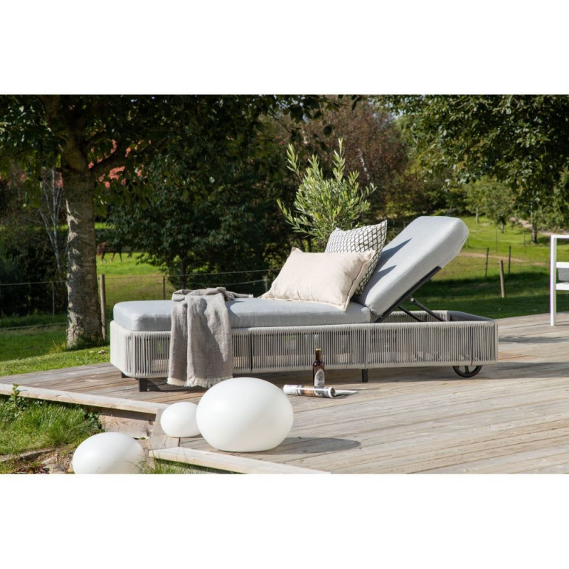 Selle klassikalise lamamistooli disain on inspireeritud Skandinaavia stiilist. Hallide köitetaoliste nööride ja valgete pehmete patjade kombinatsioon loob õdusa ja moodsa atmosfääri. Nautige lõõgastavat suvepäeva sellel soliidsel lamamistoolil. Istme kõrgus: 32 cm, istme sügavus: 129 cm. Lamamistoolil on kaks ratast ning seda on lihtne vastavalt vajadusele ümber paigutada.