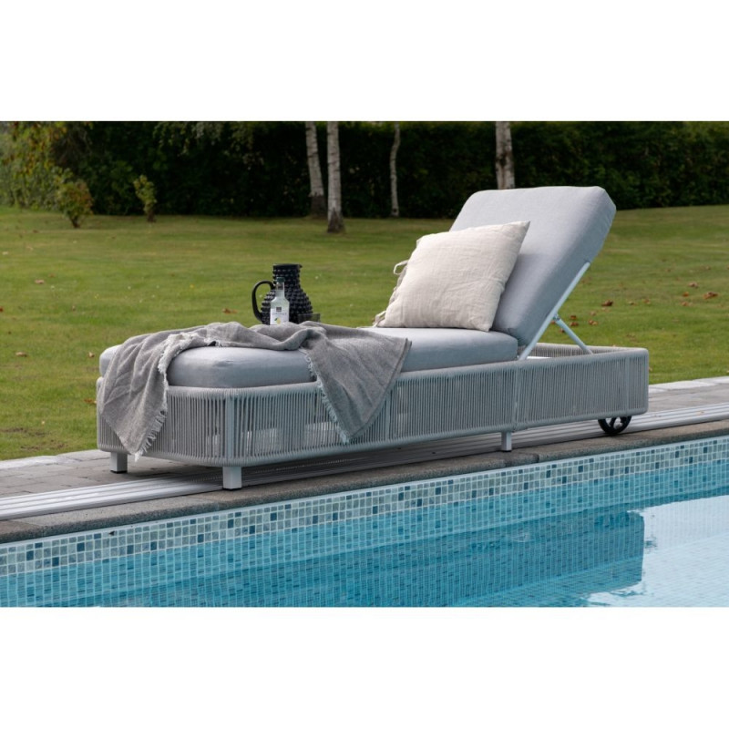Selle klassikalise lamamistooli disain on inspireeritud Skandinaavia stiilist. Hallide köietaoliste nööride ja valgete pehmete patjade kombinatsioon loob õdusa ja moodsa atmosfääri. Tooli saab kergesti liigutada tänu ratastele. Nautige lõõgastavat suvepäeva sellel soliidsel lamamistoolil. Istme kõrgus: 32 cm, istme sügavus: 129 cm.