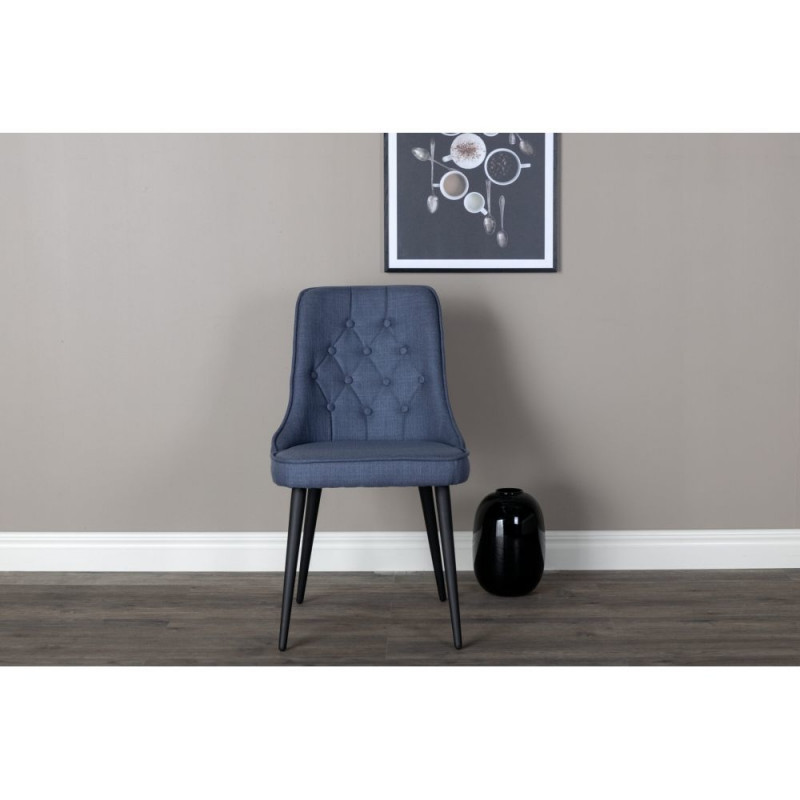 Velvet Deluxe söögitool on stiilne ja praktiline valik igasse söögiruumi. Sinine polüesterkangas on kergesti puhastatav ja vastupidav, tagades tooli pikaajalise sära ja ilme. Tooli seljatugi ja iste on kaetud sinise polüesterkangaga koos nuppude ja dekoratiivse õmblusega. Jalad on terasest, viimistletud musta pulbervärviga. Istme kõrgus: 49 cm, laius: 50 cm, sügavus: 49 cm. Kandevõime 150 kg. Toodet müüakse 2-pakendis.