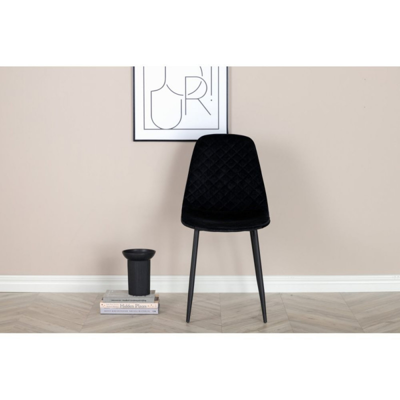 Lihtsa disaini ja stiilsete detailidega söögitool Polar seeriast. Tool pakub suurepärast mugavust tänu hästi läbimõeldud disainile, kergelt ümardatud seljatoele ja pehmelt polsterdatud istmele mustast sametisest kangast. Istme sees on dekoratiivne tikkimismuster, mis moodustab teemantikujundi. Jalad on mustast pulbervärvitud metallist. Istme kõrgus 48 cm, laius 44 cm ja sügavus 49 cm.