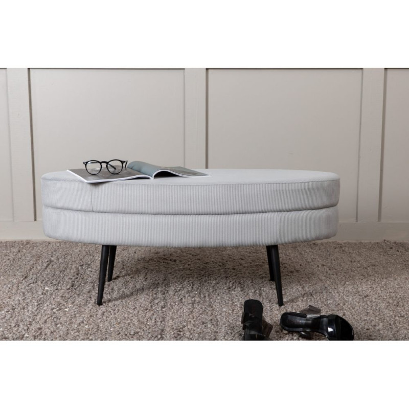 Selle trendika velvetist tumbaga kohtub moodne disain 50ndate nostalgiaga! Sileda halli Manchester polüesterkangaga kaetud tumba annab elutoale modernse ilme. Ovaalne, kuid samal ajal pehme disain ja kitsad, laienevad mustast terasest jalad loovad õhulise ja kutsuva tunde. Suurepäraselt läbimõeldud üldiselt disain võimaldab mööblit paigutada nii eraldiseisvalt kui ka diivanirühma kõrvale. Mõõdud: pikkus 100 cm, laius 40 cm, kõrgus 41 cm.
