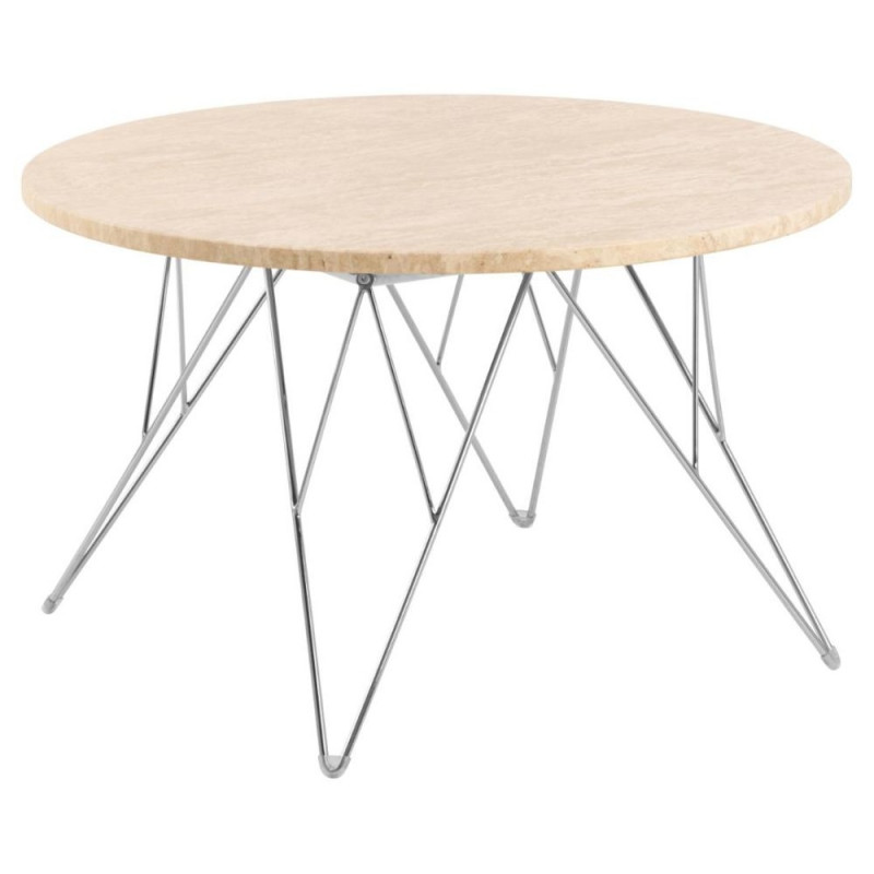 Prunus ümmargune diivanilaud on stilistiliselt silmatorkav mööbliese, mis sobib nii minimalistidele kui ka maksimalistidele. Laua pealisplaat on valmistatud visuaalselt muljetavaldavast travertiinist, mida toetab kroomitud terasest juhtmejalg. Proportsioonide tasakaalustatud kontrast annab disainile kerglase võlu. Laud kohaneb kergesti igasuguste interjööristiilide. Mõõdud: Ø80x46,4 cm.