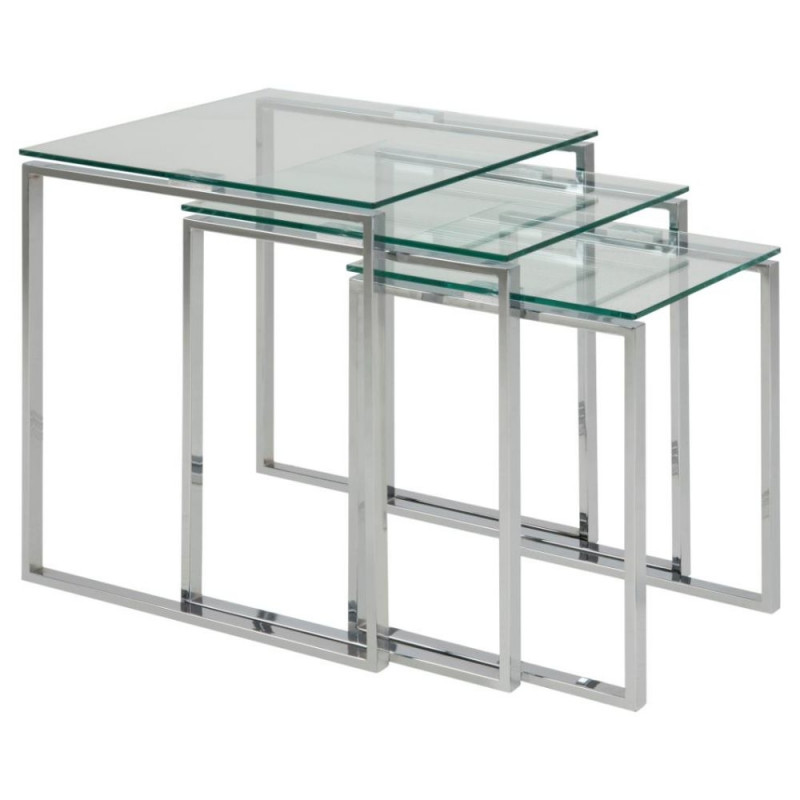 Katrine ruudukujuline diivanilaudade komplekt on ideaalne nii kaasaegsesse kui ka traditsioonilisse koju. Klaasi ja kroomi kombinatsioon annab laudadele puhta ja elegantse välimuse. See kolmest erineva suurusega diivanilauas koosnev komplekt loob elutuppa täiendavat pinda, säilitades samal ajal kerge väljanägemise. Komplektis on kolm erinevat lauda mõõtudega 50x50x55 cm, 43x43x50 cm ja 36x36x45 cm.