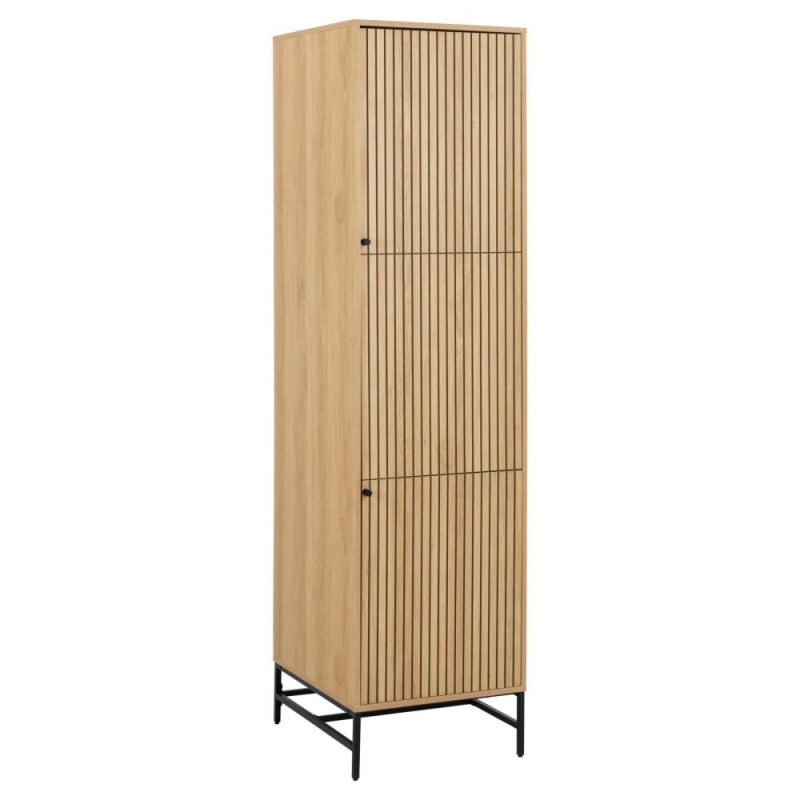Skandinaavia stiilis riidekapp tamme välimusega ja lamellustega esiküljega. Kapp köidab tähelepanu oma tasakaalustatud välimuse ja huvitava disainiga. Sisaldab 2 reguleeritavat riiulit ja riidepuu, pakkudes rohkelt hoiuruumi. Mustade metallist jalgadega ja hooldusvaba pinnaga. Mõõdud: 51,1x60x200 cm.