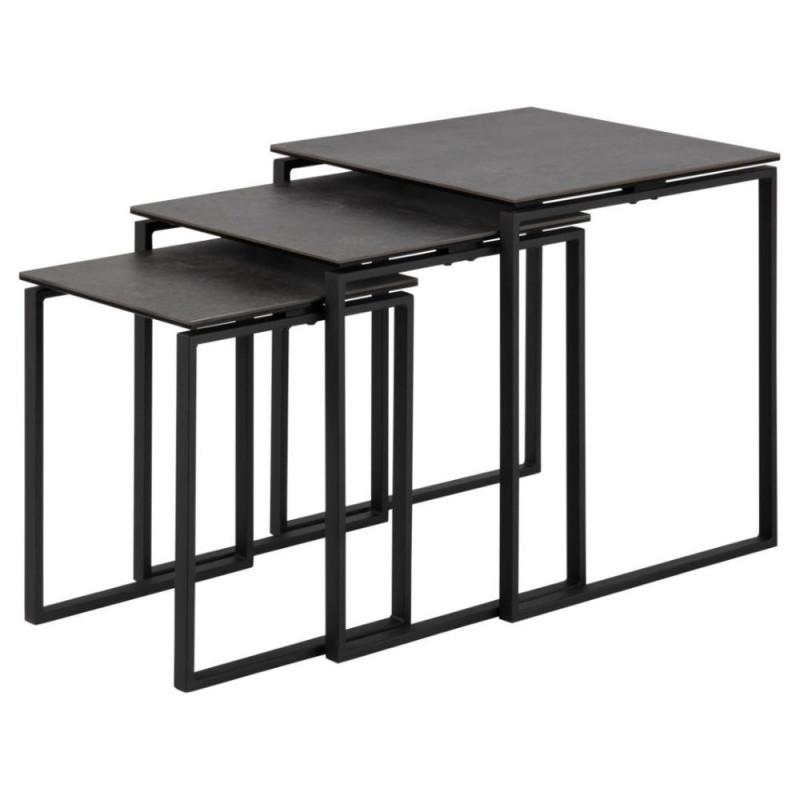 KATRINE ruudukujulised diivanilauad on stiilne ja praktiline lahendus kaasaegsesse koju. Komplekt sisaldab kolme erineva suurusega lauda: 50x50x55 cm, 43x43x50 cm ja 36x36x45 cm. Lauaplaadid on valmistatud keraamilisest materjalist, mis on kuuma- ja kriimustuskindel. Mattmustad pulberkaetud terasjalad annavad laudadele tänapäevase ja puhta välimuse. Diivanilauad on ideaalsed lisapinna loomiseks elutoas, säilitades samal ajal stiilse ilme.