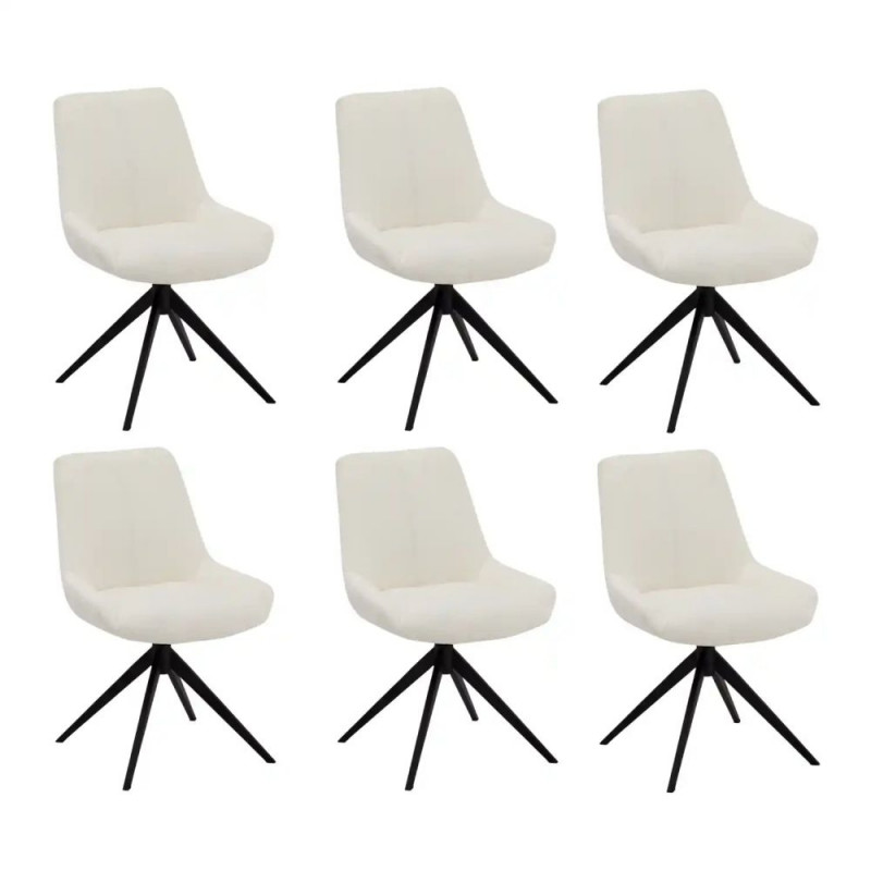 HELENA söögitoolide komplekt sisaldab 6 elegantset tooli, mis on kaetud pehme valge bouclé kangaga. Toolid on varustatud 360° pöörleva istme ja seljatoega ning seisavad mustadel metalljalgadel. Istme mõõdud on 43 cm laius, 44 cm sügavus ja 49 cm kõrgus. Seljatugi ulatub 43 cm kõrgusele istmest. Iga tool on 64 cm pikk, 56 cm lai ja 87 cm kõrge ning talub kuni 100 kg koormust.