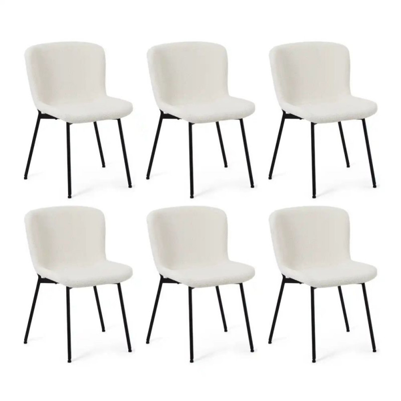 Elegantne 6-osaline söögitoolide komplekt TEDDY on kaetud pehme valge bouclé kangaga. Toolid on täidetud 24 kg/m³ tihedusega vahuga ning neil on lihtne must metallist nelja jalaga raam. Tooli mõõdud on 61×52×80 cm, istme kõrgus 49 cm, sügavus 39 cm ja laius 48 cm. Seljatoe kõrgus istmest on 39 cm. Sobib siseruumidesse kasutamiseks.