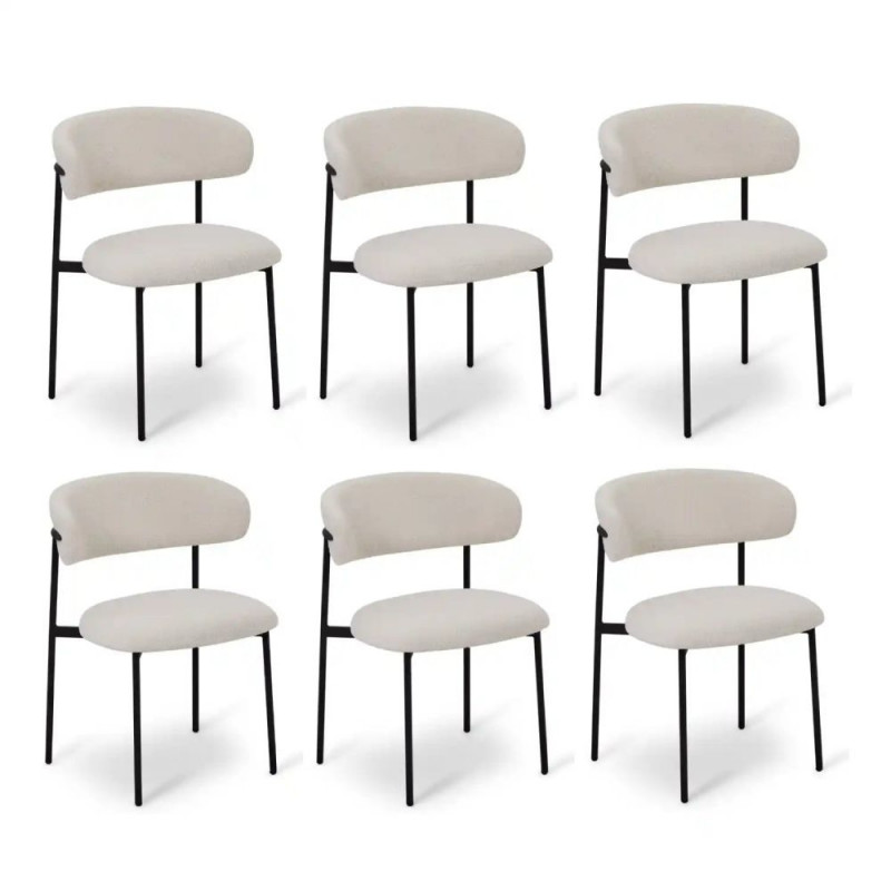 DIANA söögitoolide komplekt sisaldab 6 elegantset tooli, mis on polsterdatud valge OEKO-TEX® sertifitseeritud bouclé kangaga. Toolide istmed ja seljatoed on täidetud vahuga ning paiknevad mustadel metalljalgedel. Iga tooli mõõdud on 55×55×70 cm, istme kõrgus 49 cm. Komplekt sobib suurepäraselt siseruumides kasutamiseks ja loob kodusesse söögituppa moodsa ning mugava õhkkonna.