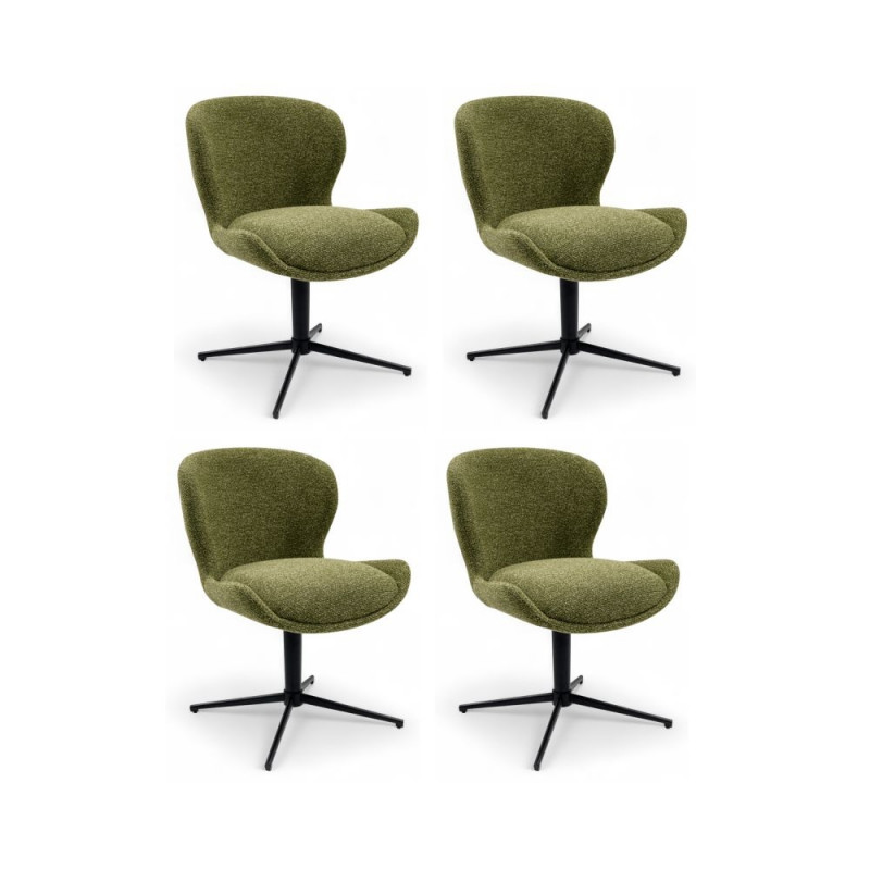NICKLAS söögitool on kaasaegse disainiga tool, mis sobib suurepäraselt Skandinaavia, industriaal- ja Japandi stiilis interjööridesse. Tooli iste ja seljatugi on valmistatud tekstuurse rohelise bouclé kangaga ning vahupadja täitega, mis tagab keskpärase pehmuse taseme. Must metallraam ja jalad annavad toolile tugeva toe ning 360° pöörlev iste lisab funktsionaalsust. OEKO-TEX® sertifitseeritud kangas on vastupidav ning sobib igapäevaseks kasutamiseks. Istme mõõdud: 44 cm (laius) x 47 cm (sügavus) x 50 cm (kõrgus). Seljatoe kõrgus 33 cm. Komplekt sisaldab 4 tooli.