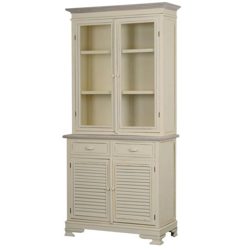 Elegantne käsitsi värvitud vitriinkapp Provence'i stiilis, millel on ilusad freesitud jalad ja merekarbi kujulised metallkäepidemed. Korpus on kreemjas mattlakiga ja helepruni ülaosa. Kapil on 2 sahtlit ja 4 ust, millest 2 on kaunistatud klaaspaneelidega. Uste taga on 2 riiulitasapinda. Mõõdud: 90 x 40 x 190 cm.