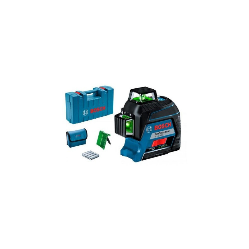 3 x 360° bold green lines for optimal visibility<br>Bright green lines provide up to four times better visibility than red lines<br>Perfect for simultaneous horizontal and vertical levelling applications thanks to three lines, for highly efficient work<br>Intuitive user interface makes it easy to operateBosch GLL 3-80 G. Maximum range: 30 m, Levelling accuracy (±): 0.03 mm/m, Self-levelling range (±): 4°. Type: Line level, Product colour: Black, Blue, Tripod thread: 1/4,5/8". Power source: Battery, Battery type: AA, Battery voltage: 1.5 V. Weight: 820 g. Number of batteries included: 4 pc(s)