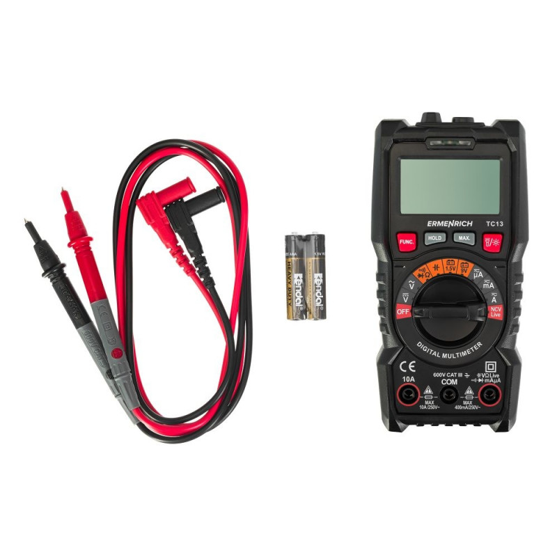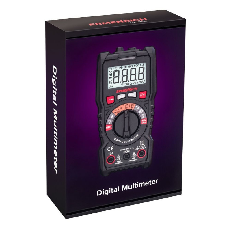 Ermenrich Zing TC13 digital multimeter is a multifunctional portable tool for testing electrical networks and measuring the characteristics of the electrical signal. The device is intended for professional use by technicians, but it can also be suitable for non-specialists for household tasks. In addition to voltage, current, and resistance, Ermenrich Zing TC13 can measure capacitance, frequency, and duty cycle.