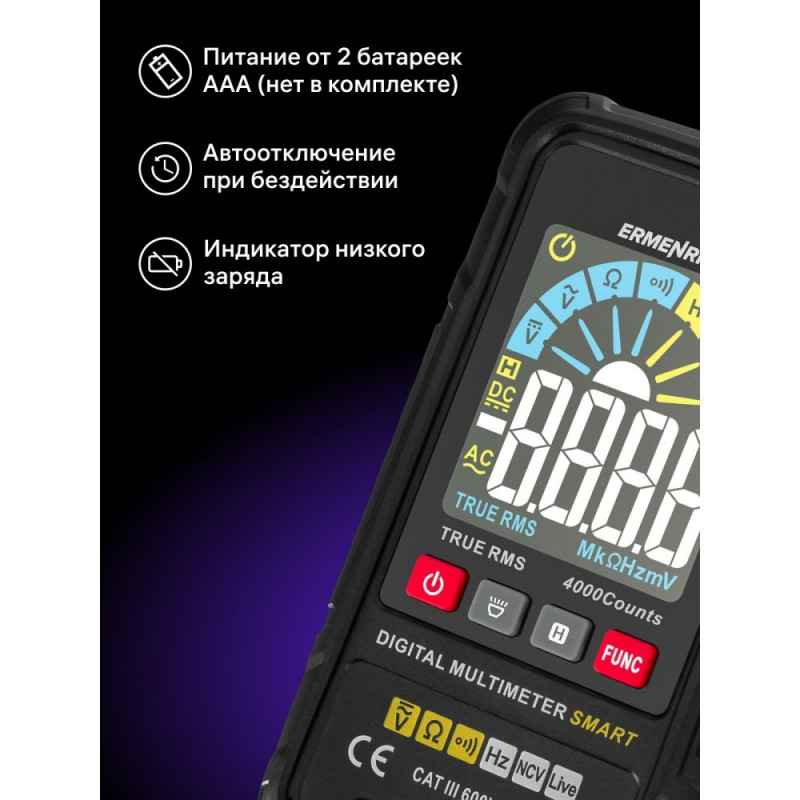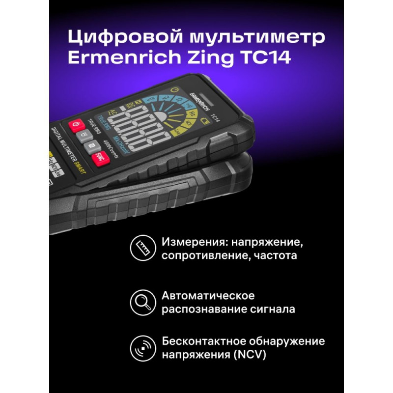 The Ermenrich Zing TC14 digital multimeter with the Smart function is a portable electrical measuring and testing device for professional and home use. When activated, it automatically detects the incoming signal and takes measurements. The Smart function works in all measurement modes except the frequency meter. If necessary, you can operate the device manually by pressing a button. The device automatically sets the measuring limit in any operating mode. All of the measurements are based on the True RMS value.