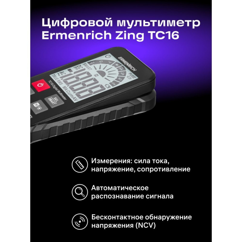 The Ermenrich Zing TC16 is a compact digital multimeter with functionality for the basic testing of electrical networks. The device is easy to operate, it provides accurate measurements, and it has a Smart function (automatically detects the type of incoming signal and measures its individual parameters). There is also an option to select the operating mode manually.
