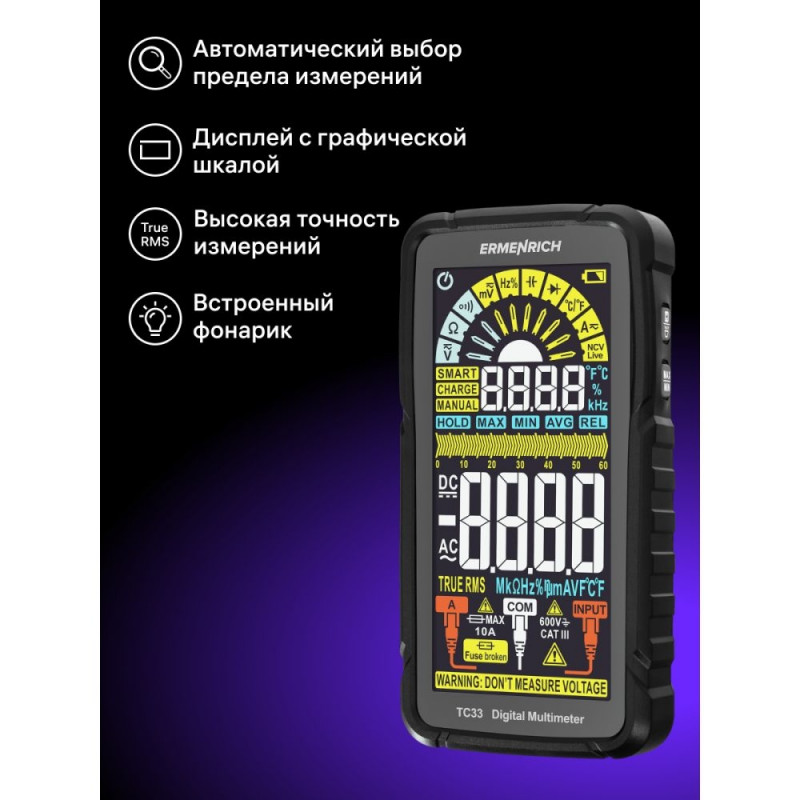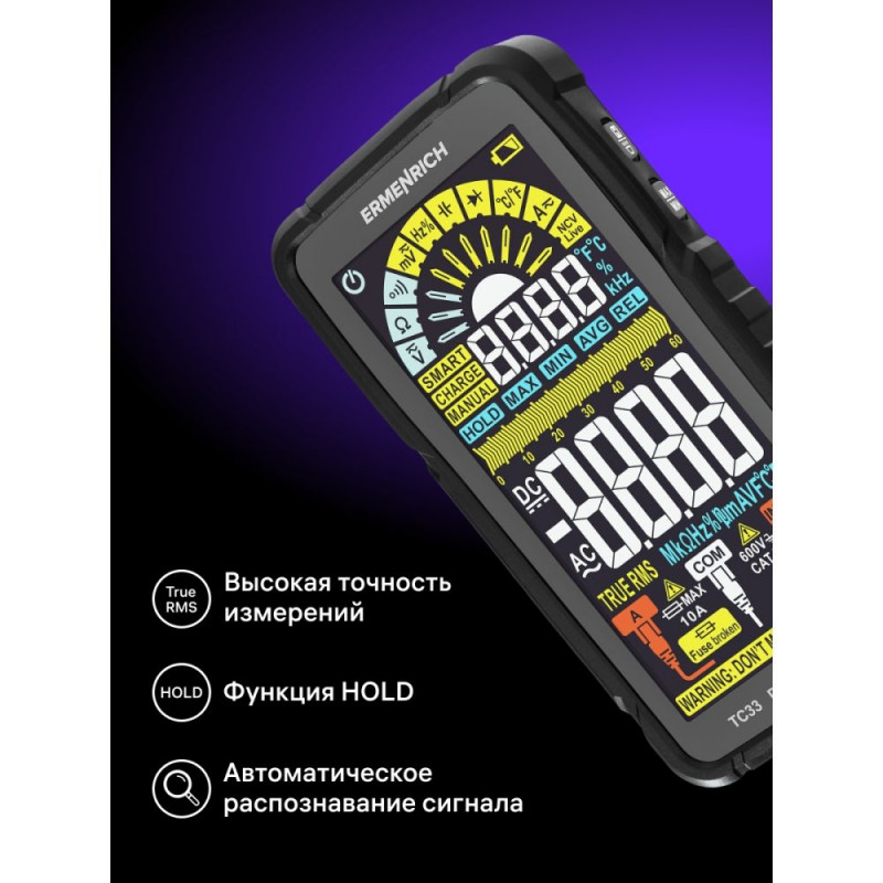 The Ermenrich Zing TC33 Digital Multimeter is a True RMS measuring device that will not take up much space in any electrician’s kit and will perfectly handle the diagnostics and maintenance of electrical networks and electrical equipment. Thanks to a wide range of functions, the multimeter is a great tool for professional tasks. It can be used by non-professionals as well, as it is equipped with smart features that make it easy to operate the device.