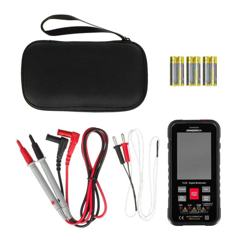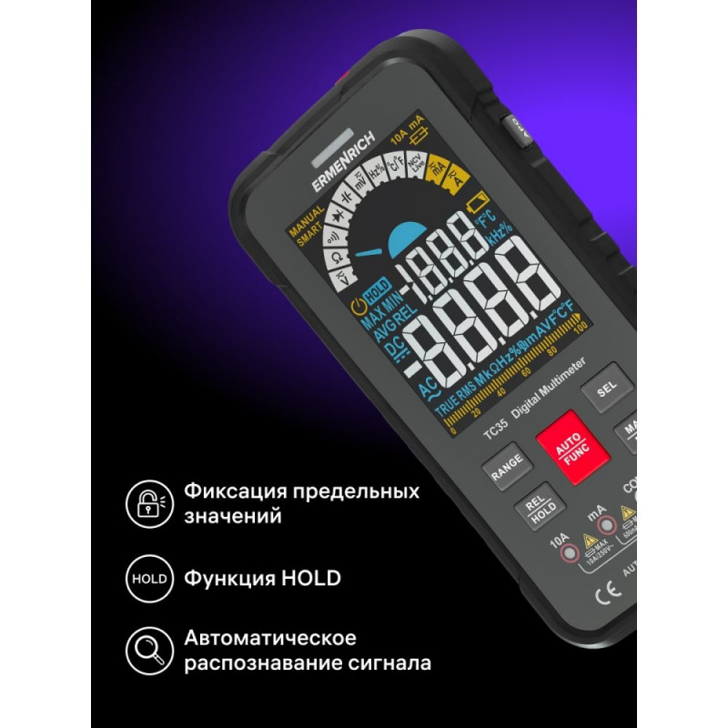 The Ermenrich Zing TC35 Digital Multimeter combines the functionality of several electrical measuring tools: voltmeter, ammeter, ohmmeter, capacitance, and frequency meter. It can measure the duty cycle and determine the temperature. The measurement limit can be selected manually or automatically. The multimeter is compact, lightweight, has a color screen with digits, and a graphic scale. The screen backlight and built-in flashlight make it easy to work in low-light environments.