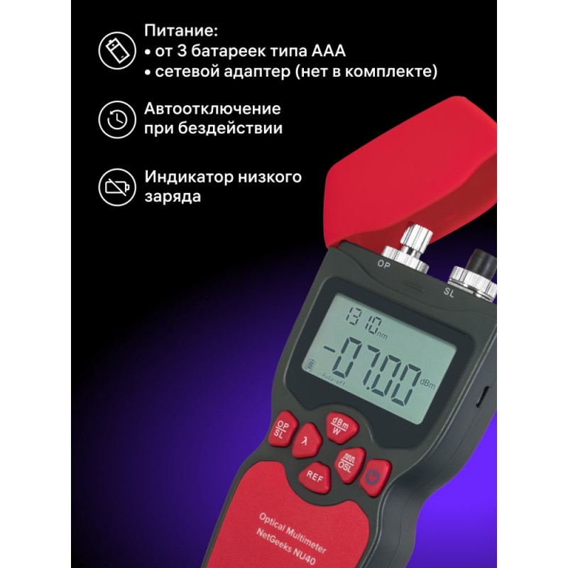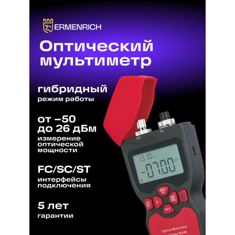 Optical multimeter, or optical power meter, Ermenrich NetGeeks NU40 – an essential tool for professionals who install and maintain fiber-optic communication lines (FOCL). The device allows you to measure the absolute power, find losses between two points in the line, locate faults, and indicate them with a red light (VFL function). There is a light source test function.