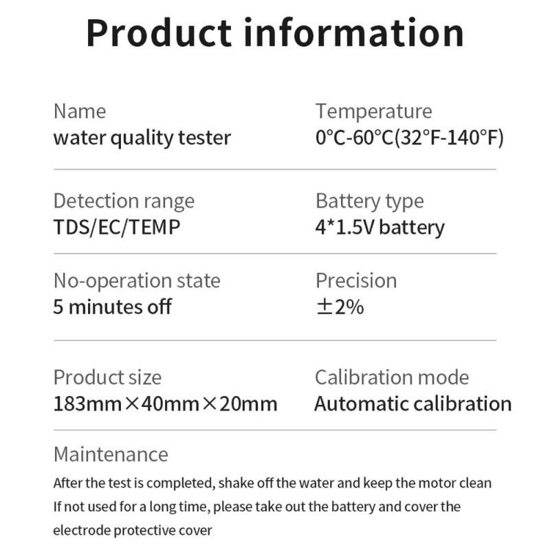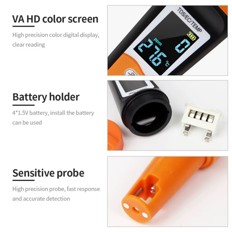 Peamised omadused:- 3-in-1 funktsionaalsus: Täpselt mõõdab lahustunud tahkete ainete (TDS), elektrijuhtivuse (EC) ja temperatuuri, rahuldades erinevaid veekvaliteedi testimise vajadusi.