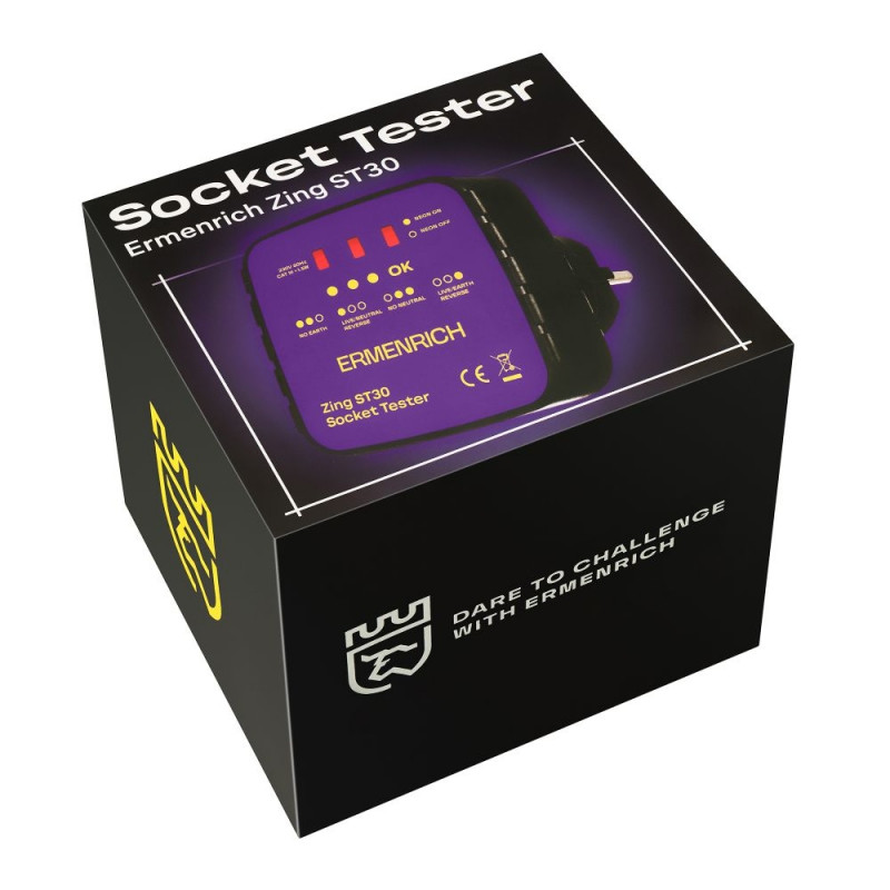 The Ermenrich Zing ST30 Socket Tester is designed to test whether all of the sockets are properly wired and to check the voltage. The tester must be plugged directly into a socket, and the LED’s flashing will indicate various electrical faults: no ground/no neutral, live/neutral reverse, or live/ground reverse. In addition, the specific color code that appears on the tester screen signals the correct wiring condition. The function of each code is written on the device.