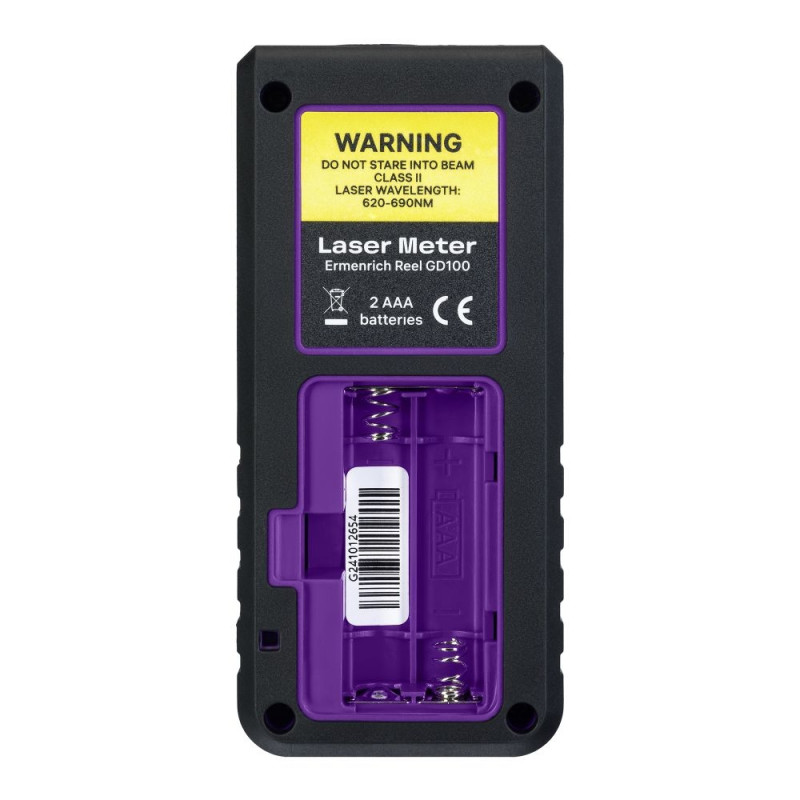 The Pythagorean theorem feature is another advantage of the Ermenrich Reel PLUS GD100 laser meter. It can automatically calculate distances between points by intermediate measurements in difficult and restricted working areas. The ergonomic design allows you to hold the device with just one hand without the use of a tripod or accessories. The laser meter is powered by 2 AAA batteries, one set of batteries lasts for over 5,000 measurements. If you don’t use the device for a while, the power-saving auto-off function will switch off the laser first, and then the laser meter itself.