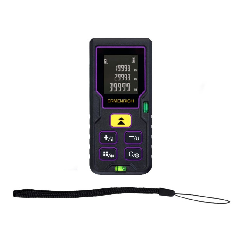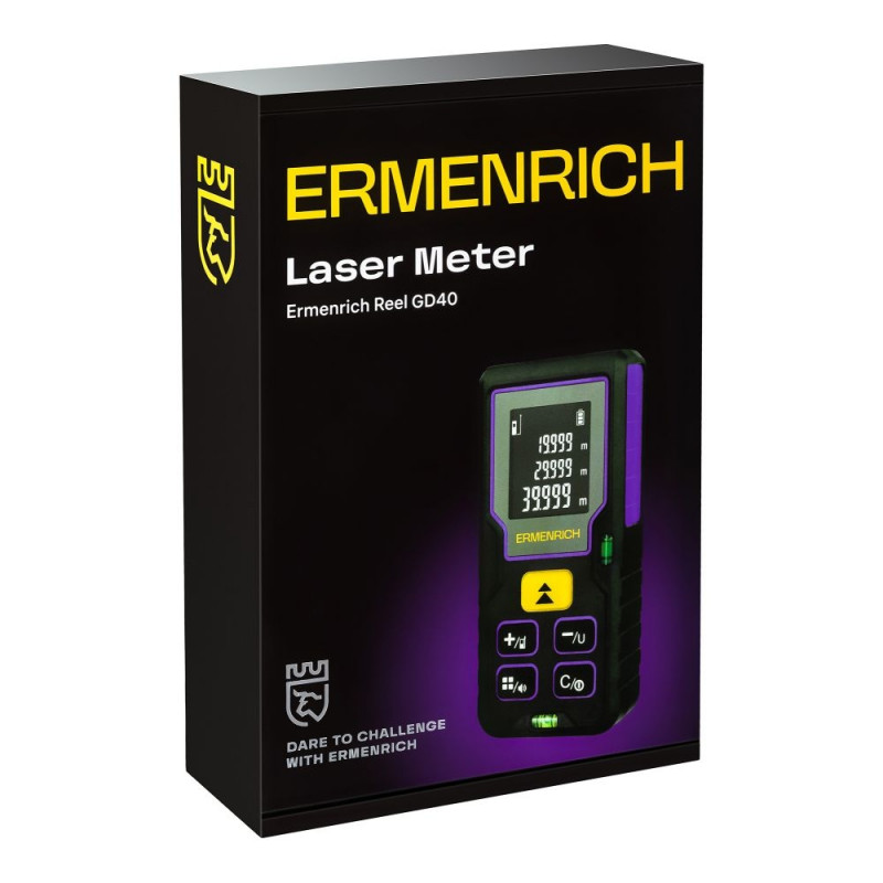 El medidor láser Ermenrich Reel PLUS GD40 es un instrumento para realizar diversas mediciones en habitaciones pequeñas y medianas. Esta herramienta versátil se puede utilizar en obras de construcción y reforma, y en trabajos de decoración de interiores, fabricación y montaje, y en muchas otras áreas de aplicación. La distancia máxima de medición del dispositivo es de 40 metros. Además de las mediciones de una sola distancia, el medidor láser puede medir el área y el volumen en el modo de medición continua.