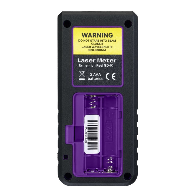 El medidor Ermenrich Reel PLUS GD40 puede utilizar el teorema de Pitágoras para calcular automáticamente la distancia entre dos puntos basándose en parámetros indirectos cuando el rayo láser no se pueda dirigir con precisión a uno de los puntos. El dispositivo funciona con 2 pilas AAA. Se pueden realizar más de 5000 mediciones con un solo juego de pilas. El diseño ergonómico y la pantalla LCD de 3 líneas aseguran un manejo cómodo en entornos de trabajo difíciles. Para ahorrar energía de las pilas, existe una función de apagado automático para el láser y el propio dispositivo, así como un indicador de estado de pila baja.
