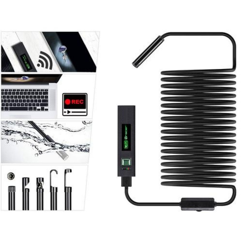 A multi-purpose endoscopic camera, Tracer HardWire USB, will be perfect for any situation in which an inspection/access to hard-to-reach spots, such as sewage pipes, vents, machines, engines, vehicles, etc. The selected area, lit with 6 LEDs (with adjustable light intensity) may be photographed or filmed and saved on your phone/computer.<br><br>Thanks to the WiFi connection, you may display the image and manage it wirelessly from your smartphone screen, which makes operating the phone and the inspection camera easier and allows you to operate them independently. The device is powered by a 3.7V integrated lithium battery with capacity of 500 mAh.<br><br>5-meter long, stiffened video cable will allow you to introduce the inspection camera in any direction, without the ‘lens sliding’ effect. Unlike flexible cords, you may adjust the shape of this cable in order to introduce it into tight spots and display the image of that precise spot on your monitor or your smartphone screen.<br><br>Thanks to dedicated software, the endoscope allows you to preview and record the image on your computer or your phone through a wired connection using a USB port, and wirelessly on a tablet or a smartphone, both with Android and iOS operating systems.<br><br>A set of replaceable tips (hook, magnet, mirror) will allow you not only to preview, but also grab objects from tightest nooks, and a tightening cap will permit you to operate the lens under water!Tracer HardWire. Power supply type: Battery, Battery capacity: 500 mAh