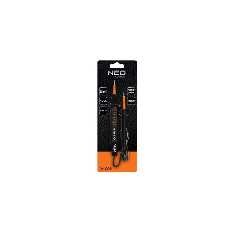 The 8-in-1 AC/DC 6-380 V 94-006 NEO Multifunctional Voltage Tester<br>is an indispensable multitasking tool for the electrician and mechanic professions, allowing you to check the zero in the electrical harness in cars, as well as the phase in electrical switchgear. It supports DC and AC voltage ranges from 6 to 380 V AC/DC. It comes with two practical probes and an 80 cm long cable.<br>The device has as many as eight functions in one tester, saving space in your tool case. It features no need for battery power. It has both options to verify the presence and value of voltage in AC and DC sockets. It helps to easily trace the fault in order to eliminate it. Its total length is 195 mm.<br>Product features:<br>8-in-1 multifunctional voltage tester,<br>two probes,<br>checking the presence and value of voltage in AC sockets,<br>checking the presence and value of voltage in sockets with direct current,<br>checking zero in the electrical harness in cars,<br>checking the phase in electrical switchboards,<br>no need for battery power,<br>cable length - 80 mm,<br>easy to use.<br>Voltage range:<br>6 to 380 V.<br>Tool length:<br>195 mm.NEO tools 94-006. Quantity per pack: 1 pc(s). Weight: 52 g
