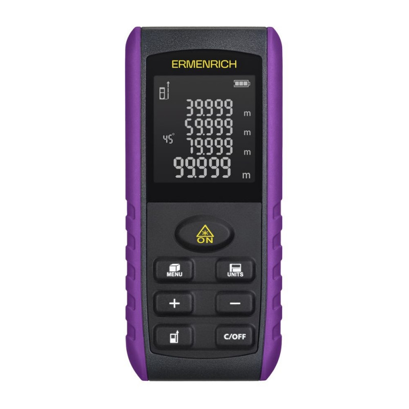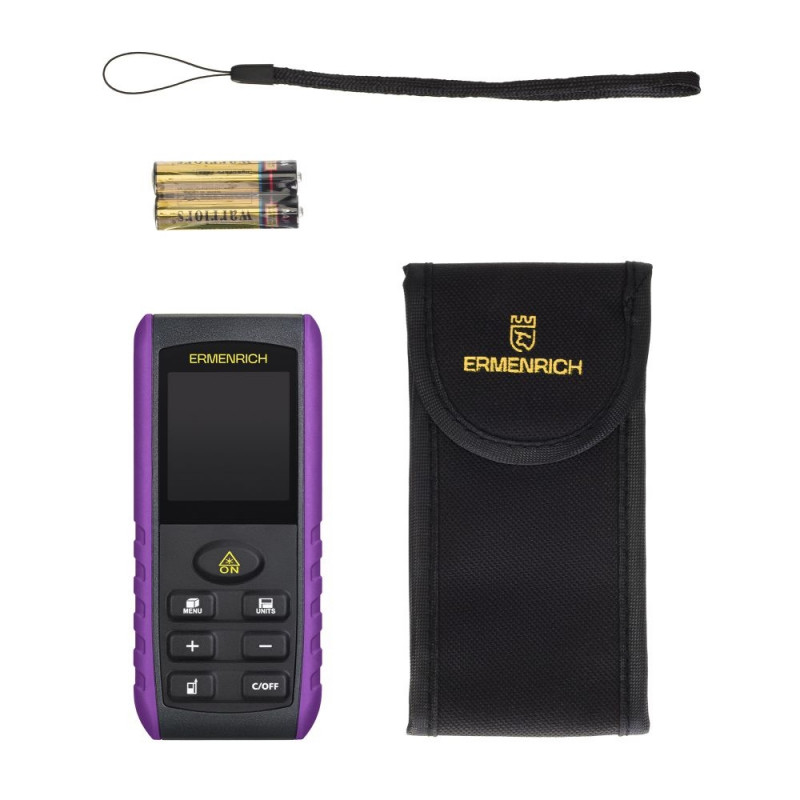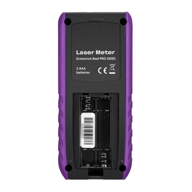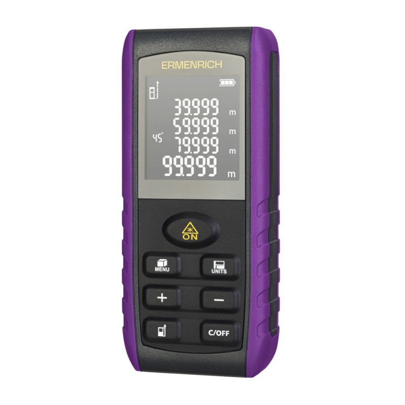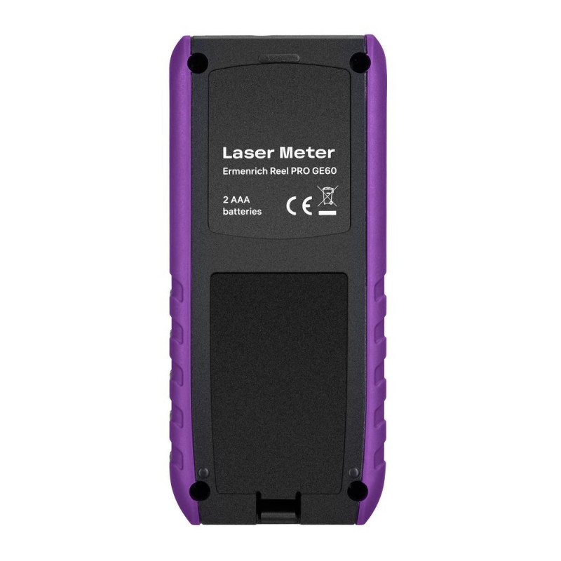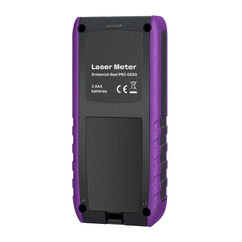 The Ermenrich Reel PRO GE60 laser meter enables you to make accurate distance measurements in the range of 0.05 to 60 meters (0.16–197ft) as well as measure the angles, area, and volume of rooms and objects. An important advantage of the device is the Pythagorean theorem feature: If it is not possible to put the meter at the desired position or an obstacle appears in the path of the laser, it is enough to make two additional measurements, from which the meter will calculate the distance.