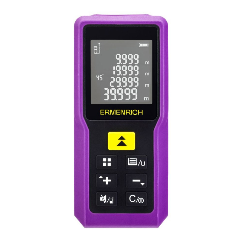 El dispositivo Ermenrich Reel PRO GM100 es un medidor láser diseñado para realizar mediciones en obras de construcción y reforma. También se puede utilizar para levantamientos de límites de terrenos y trabajos de topografía, y otras aplicaciones que requieran una medición precisa de las dimensiones lineales de un objeto, su área y volumen. La distancia máxima de medición es de 100 metros. El medidor láser también puede actuar como medidor láser de ángulos. Gracias al empleo del teorema de Pitágoras, el dispositivo puede calcular distancias automáticamente a partir de mediciones intermedias. Este procedimiento es especialmente útil cuando no es posible apuntar el rayo láser de forma precisa desde un punto a otro.