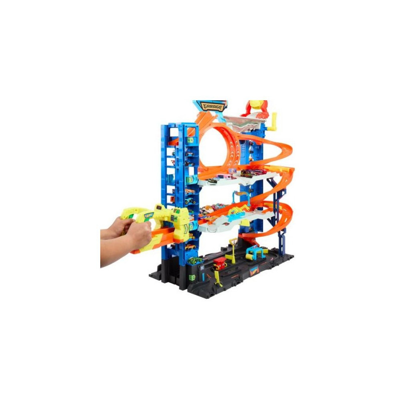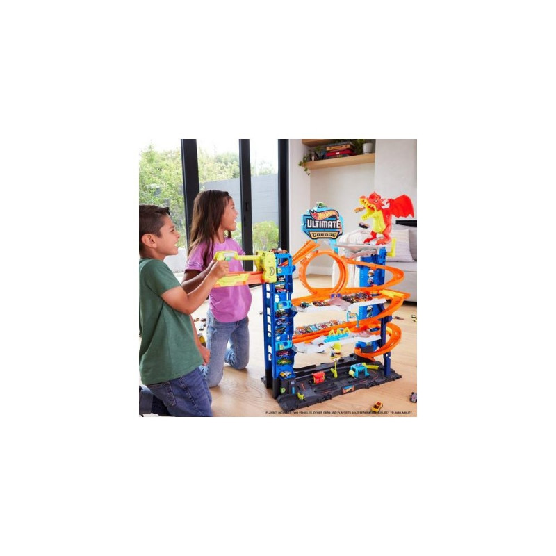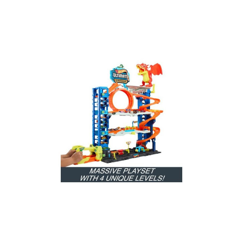 Explore all four levels of racing, stunting and storytelling in the Hot Wheels City Ultimate Garage just like the kids in the Netflix series 'Let's Race'. Each level inspires track-play adventures including side-by-side racing, loop stunts and an epic battle with a car-eating dragon. The set comes with two Hot Wheels vehicles and has enough parking for more than 50 1:64 scale toy cars. It also connects to other sets so kids can build out their Hot Wheels City. Additional sets sold separately. Colours and decorations may vary.Hot Wheels City Ultimate Garage Playset from “Let’s Race” with 2 Toy Cars & Storage for 50+ Cars. Product type: Vehicle & track set, Recommended age (min): 4 yr(s), Recommended age (max): 5 yr(s), Material: Plastic, Product colour: Multicolour