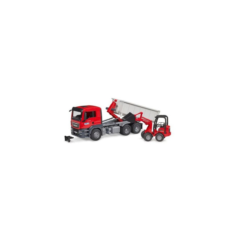 The MAN TGS is the perfect, all-around vehicle for construction sites, long-haul deployment, and local distribution. Thanks to durable design, featuring powerful engines, and providing an over-average payload, this truck is the prototype of the frequently described "all-around vehicle" with plenty of innovations on board. The two-tone cab features doors that can be opened to provide any bworld figure with a modern place of work. The transport container has two swiveling hinged doors at the end and can be lowered and picked up again at the rear by the gripper arm. When the container stands on the floor and the doors are open, the smaller BRUDER vehicles can even drive into the container and then be transported by the container lorry. This possibility is used very often in reality on construction sites and little builders can recreate these flexible possibilities in the children’s room. The popular Schäffer Compact loader 2630 is included in this great combination.<br>BRUDER MAN TGS Truck. Product type: Truck & track set, Recommended age (min): 3 yr(s), Material: Plastic, Product colour: Multicolour
