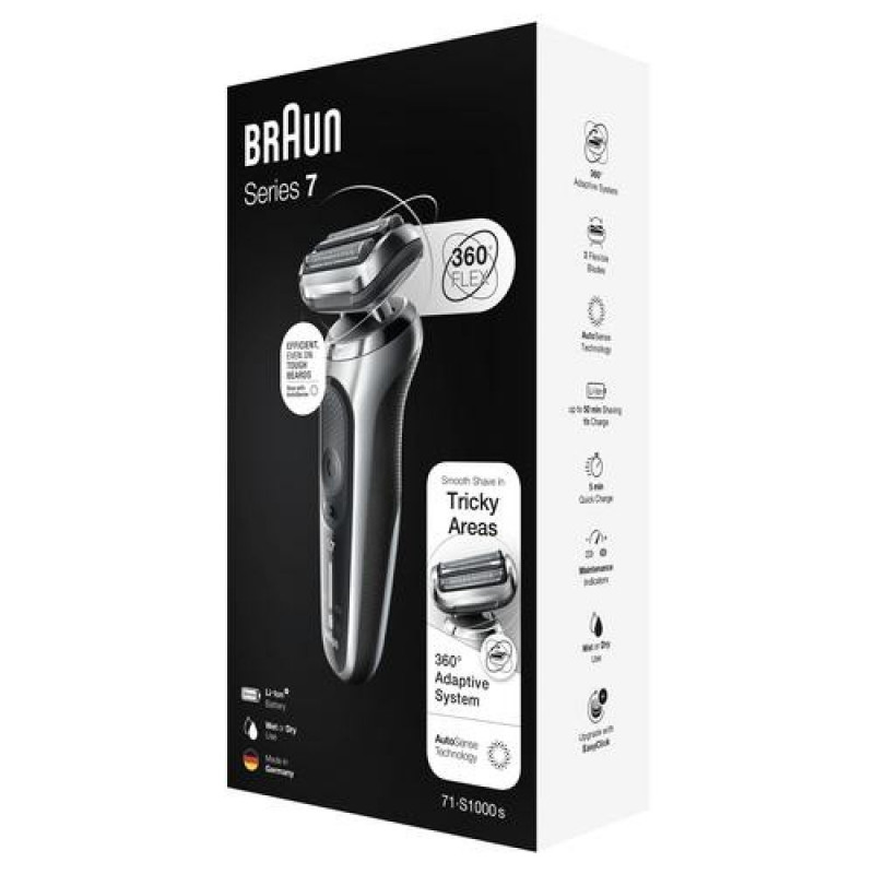 <br />Braun Series 7 71-S1000s. Shaver system: Foil shaver, Product colour: Silver, Shaving system technologies: AutoSense, 360° Adaptive system. Power source: Battery, Battery technology: Lithium-Ion (Li-Ion), Battery type: Built-in battery. Package type: Box. Quantity per pack: 1 pc(s). Handle(s) features: Soft grip