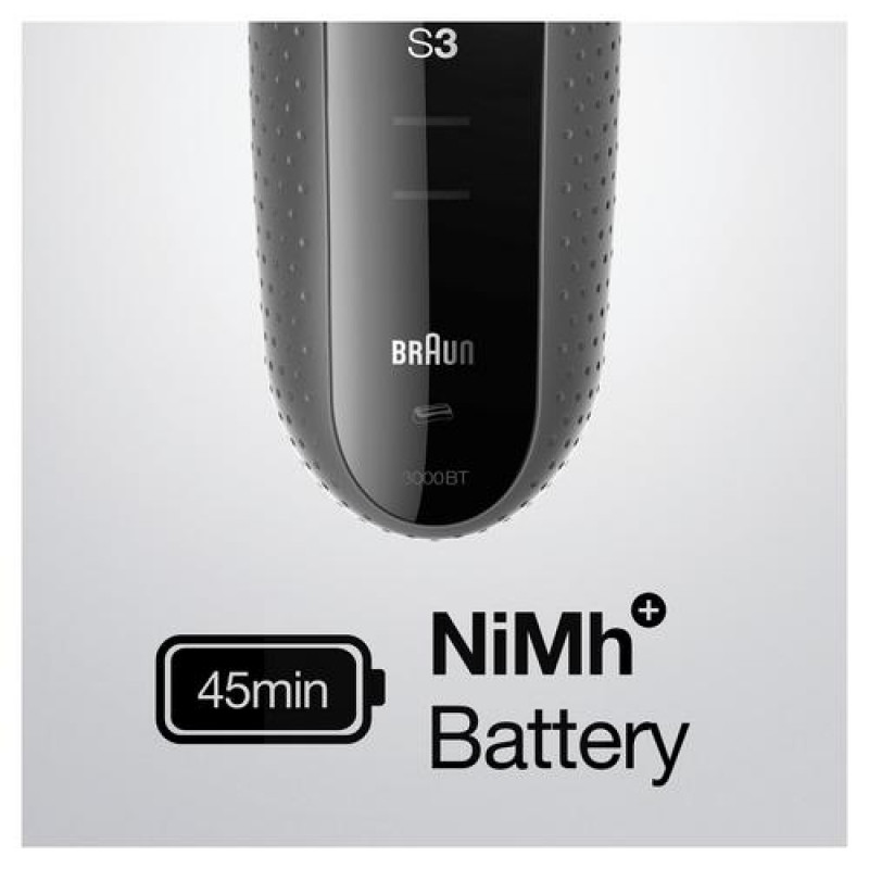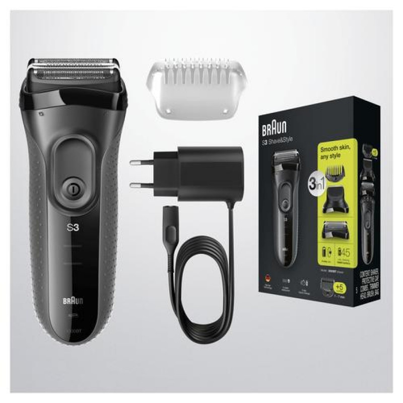 The Braun Series 3 Shave&Style rechargeable electric foil shaver/razor is the ideal 3-in-1 grooming tool. Choose between clean shaving or precision beard trimming and styling by simply switching the head of the device and adding one of the 5 comb attachments to achieve your desired stubble length.<br><br><b>3 in 1 precision styling tool</b><br>With easy to change heads.<br><br><b>Even trim</b><br><br>Attach one of the five combs (1-7mm) for your preferred beard style: a masculine 3-day beard or that casual stubble look.<br><br><b>Precise edge</b><br><br>Attached the trimmer head for easy sideburn and moustache shaping. Braun’s lifetime-lasting sharp blades are engineered to the highest standards.<br><br><b>MicroComb technology. Catches and feeds more hair for a faster shave.*</b><br><br>It features two rows of fine, evenly spaced grooves that surround an independently moving middle trimmer. This catches and feeds more hair with every stroke, which gives you a faster shave. The difference to other shavers is noticeable, especially in the torture test of 3‐day beards.<br><br><b>Triple Action Cutting System</b><br><br>Twin foils and an integrated middle trimmer shave progressively closer. Together they effectively cuts both long and short hairs with every stroke, proven even on difficult 3-day beards.<br><br><b>2x SensoFoil</b><br><br>Specially designed to deliver an efficient close shave and a gentle skin experience<br><br><b>Middle trimmer</b><br><br>Easily cuts even longer and more difficult hair.<br><br><b>Great handling</b><br><br>The ergonomic grip with iconic Braun rubber dot pattern provides secure handling, even in wet bathroom conditions or when you rinse your shaver under running water.Braun Series 3 3000BT Shave&Style. Shaver system: Foil shaver, Shaving system technologies: 2 SensoFoil, Blade material: Stainless steel. Product colour: Grey, Display type: LED. Power source: Battery, Battery technology: Nickel-Metal Hydride (NiMH), Battery type: Built-in battery. Weight: 366 g. Package type: Box